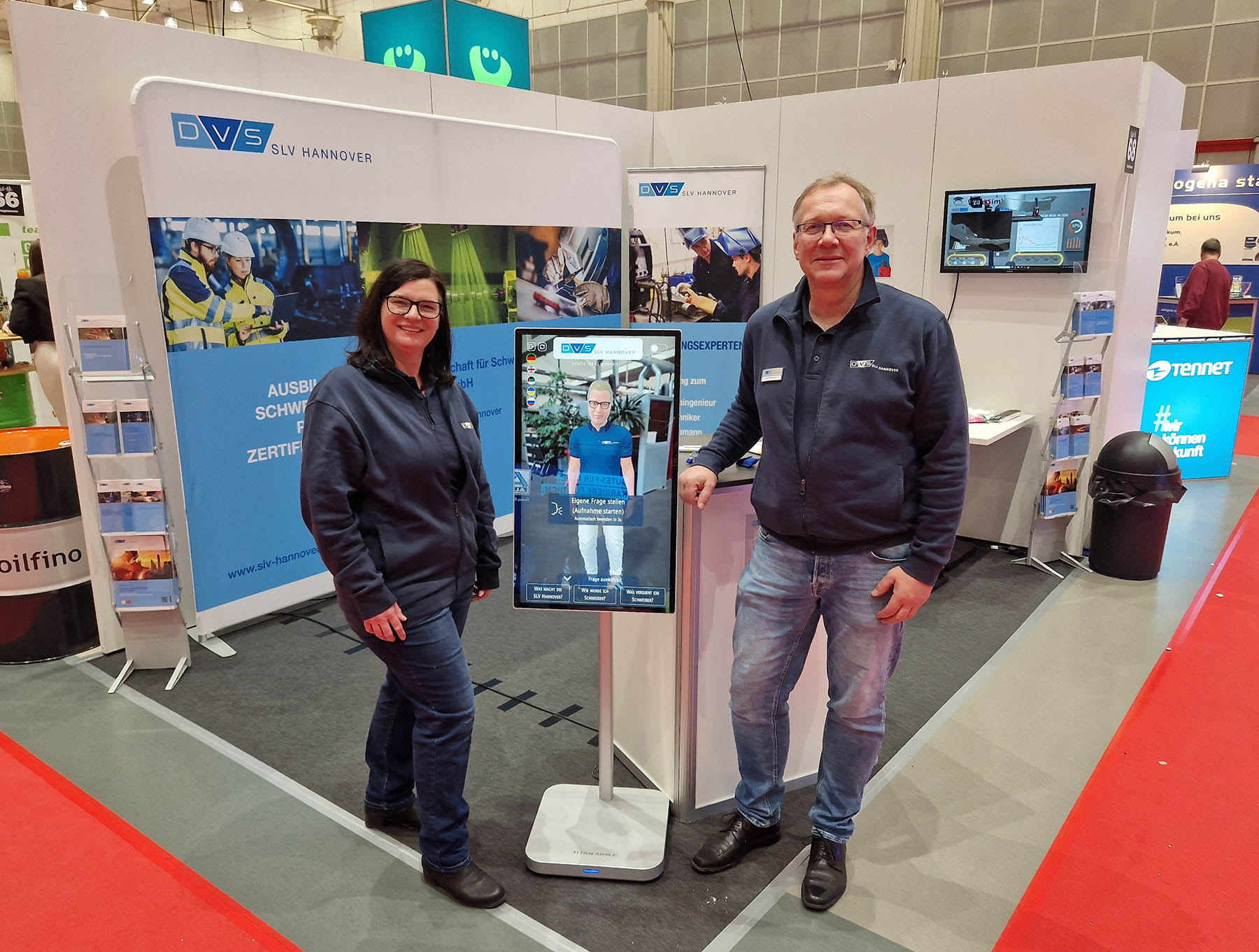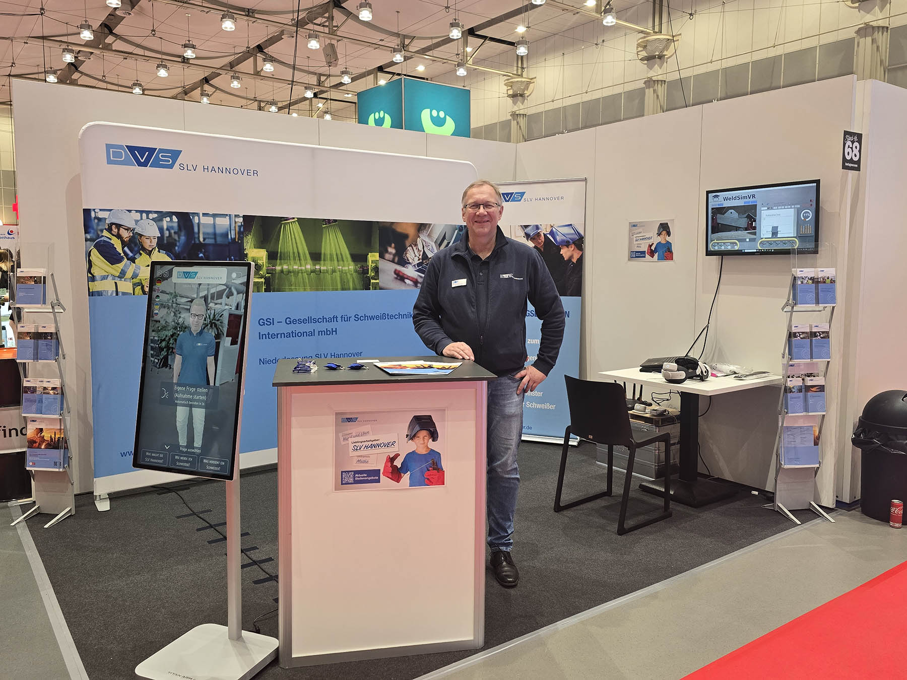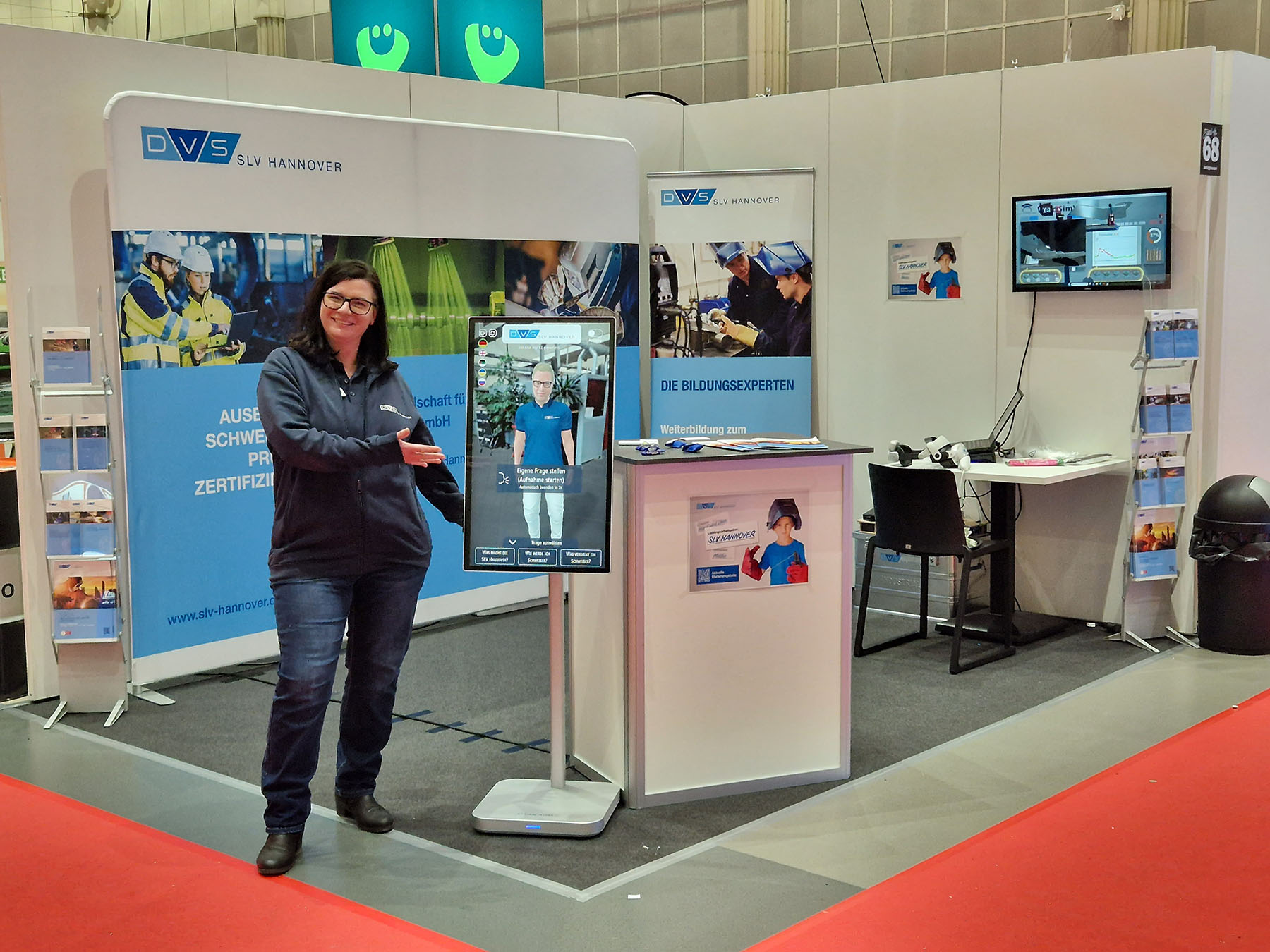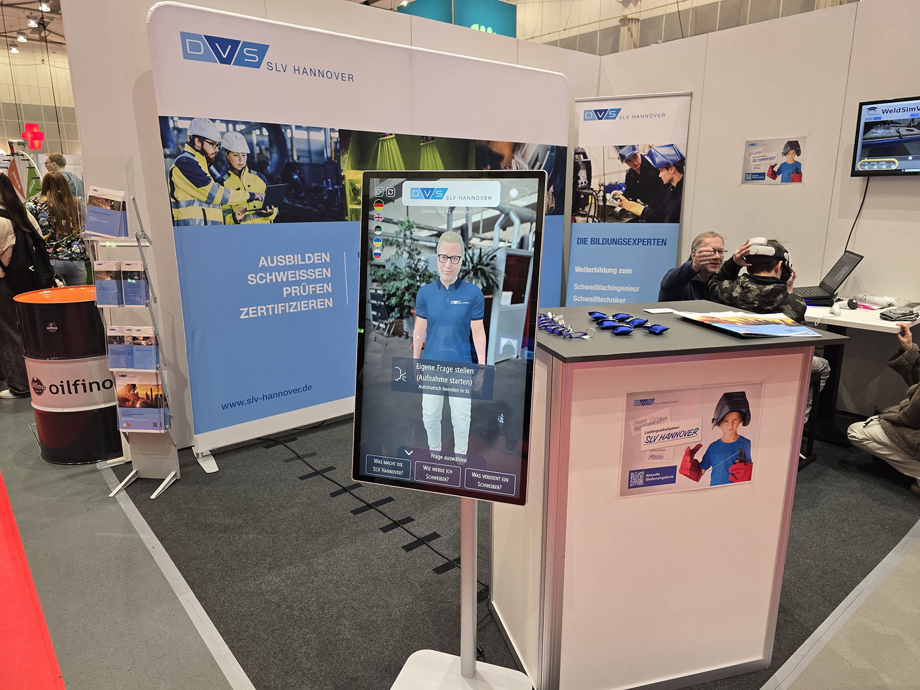 Da Erlebnisse besser im Gedächtnis bleiben als das Gesprochene, boten wir an unserem Stand auch in diesem Jahr wieder zwei Erlebnis-Highlights an. Die Besucher hatten zum einen die Möglichkeit, das Schweißen mit unserem VR-Schweißtrainer direkt zu testen und das eigene Können zu prüfen. Zum anderen konnten sie sich durch unseren KI-Thomas über unser Unternehmen und Weiterbildungsmöglichkeiten in der Schweiß- und Prüftechnik beraten lassen – und das in ihrer Herkunftssprache. Beide Highlights fanden bei den Besuchern großen Anklang, sodass wir zeitweise eine Warteschlange am Stand aufwiesen.